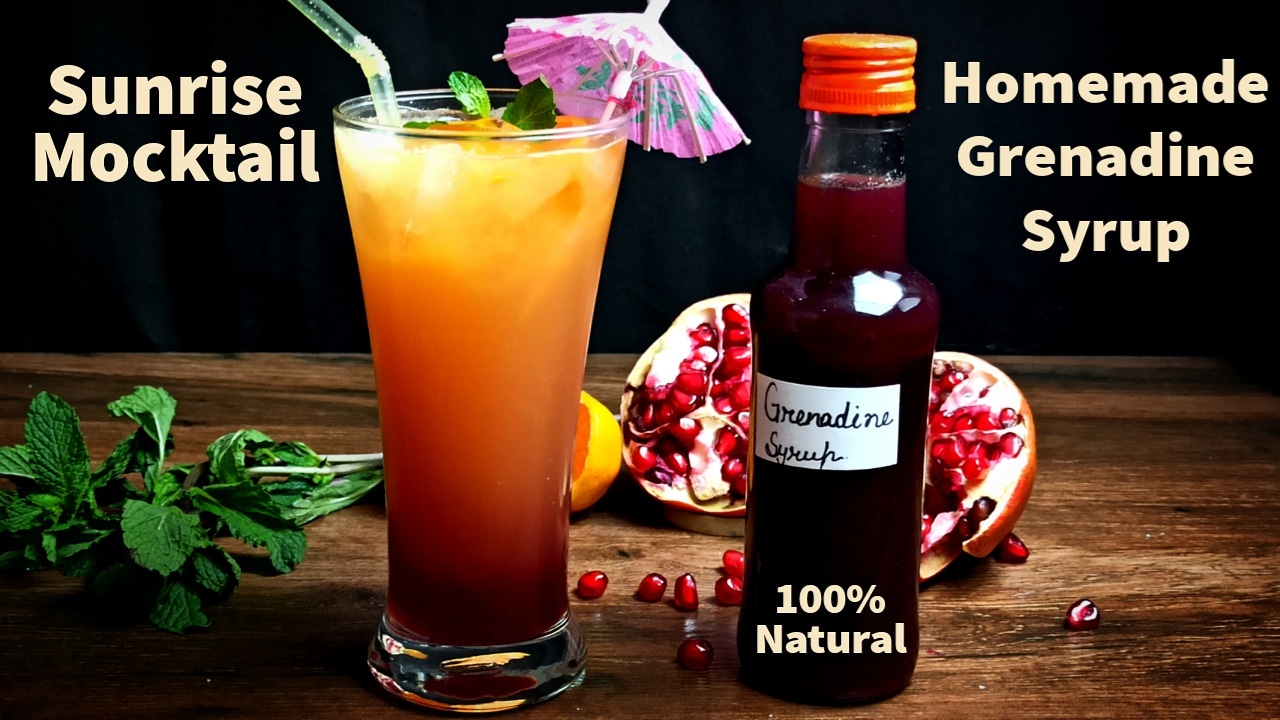 Today I have shared homemade Sunrise Mocktail with homemade Grenadine syrup.Grenadine syrup is a Mocktail & cocktail mixer made from fresh pomegranate juice reduced with sugar like simple syrup with a hint of citrus flavor and stunning red color. The name “grenadine” comes from the French word grenade, which means “pomegranate.”